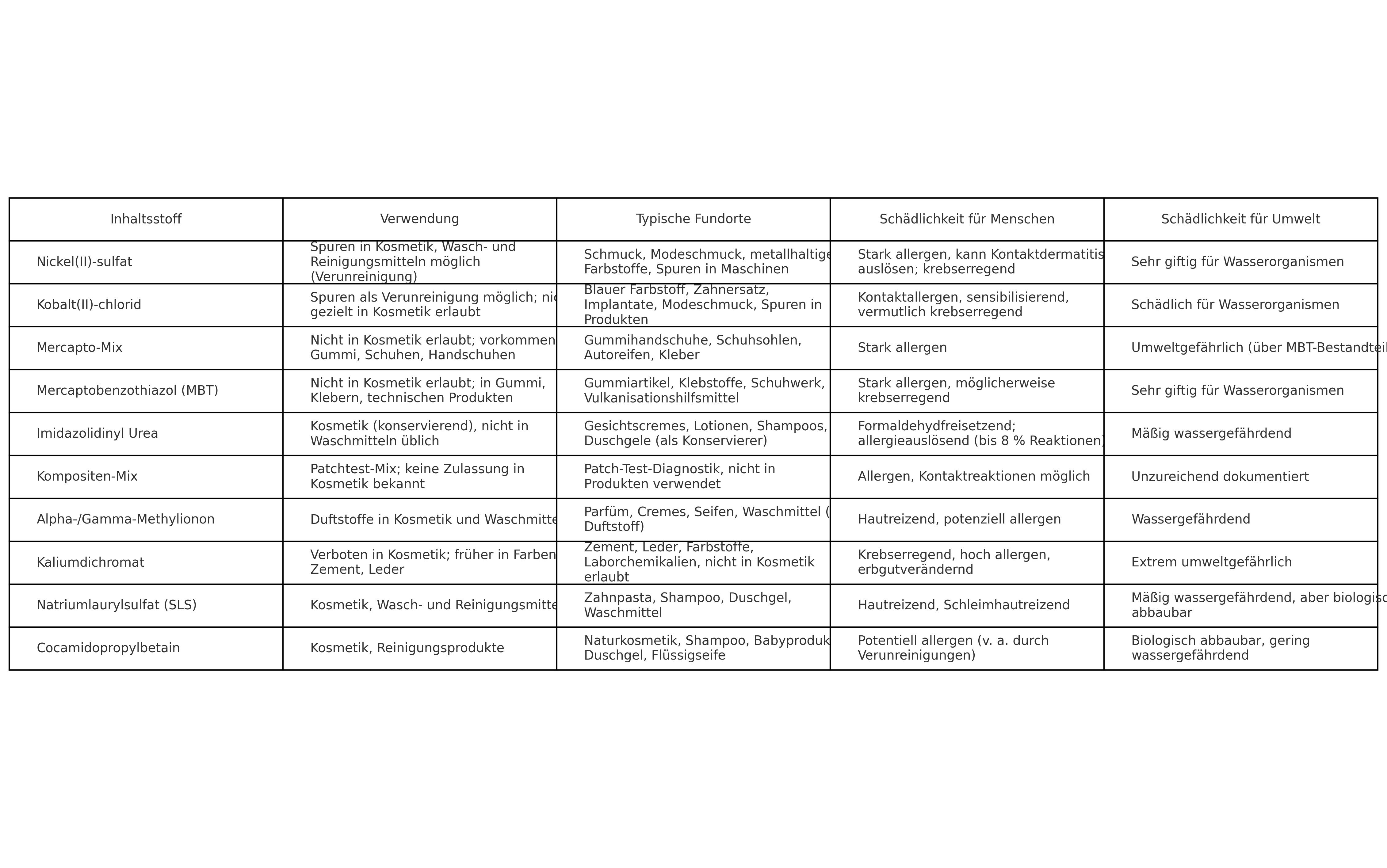 Allergien | Kein klassisches Allergen, aber bei vorgeschädigter Haut können entzündliche Reaktionen auftreten. |